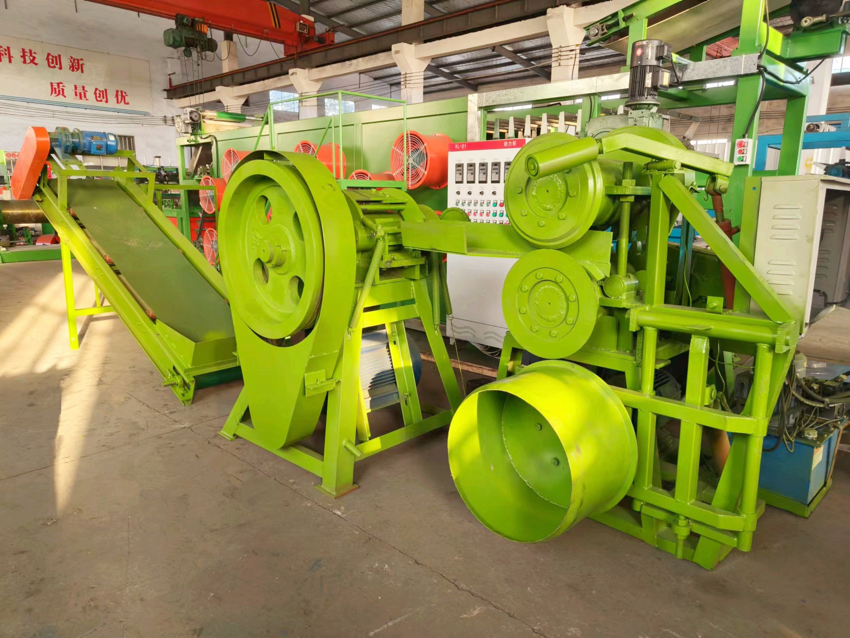 2. Een operator plaatst de door de bandendemontagemachine uitgesneden straal van de band op de roterende pallet. De pallet wordt opgetild door de hydraulische cilinder die wordt bestuurd door de bedieningsknop. De snijder eet en snijdt automatisch in kleine stukjes rubber van 50 mm. De knipbewerking zal cyclisch zijn tot aan de lipring. Na het snijden van de lipring keert de knop terug naar de hydraulische cilinder om de lipring te verwijderen en door te gaan met het doorsnijden van de radiusband door de bandendemontagemachine. Deze cyclus kan werken.
